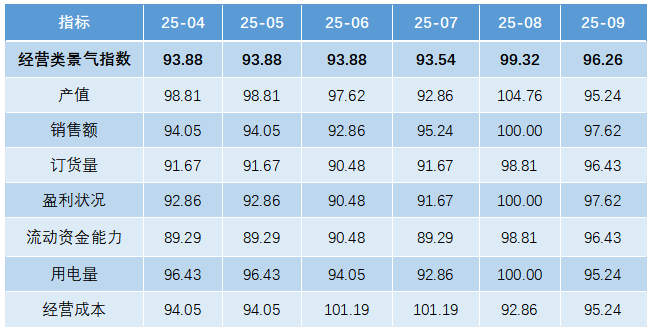 7月,筹备类景气指数为93.54点,较6月回落0.34个百分点。个中,贩卖额、订货量、结余状态三项目标指数分手回升至95.24点、91.67点、91.67点,产值、滚动资金才具、用电量三项目标指数分手回落至92.86点、89.29点、92.86点。8月,筹备类景气指数回升至99.32点。企业实践筹备行径一切向好,各项环节目标涌现亮眼。产值指数上升至104.76点,贩卖额和结余状态景气指数回升至100.00点,订货量和滚动资金才具景气指数也均回升至98.81点。9月,筹备类景气指数回调至96.26点,但仍高于二季度末程度。