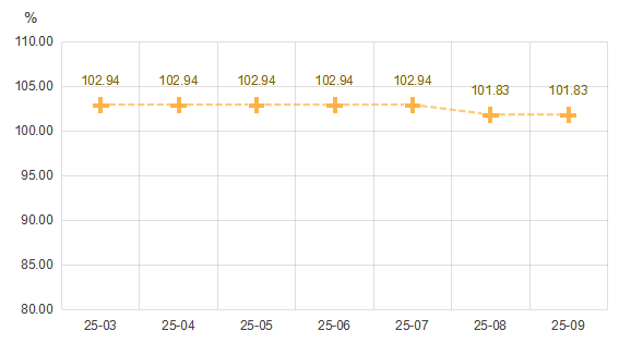 2025年三季度,水晶原资料价值指数小幅回落。7月,原资料价值指数收于102.94点,与6月持平,同比微跌0.37%。8月,原资料价值指数回落至101.83点,环比下跌1.08%;9月维持安谧。指数运转如下图所示:
