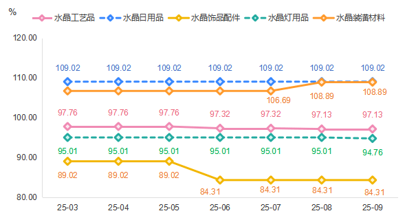 水晶饰品配件和日用品价值指数维持安谧。7-9月,水晶日用品价值指数安谧正在109.02点。举动刚需品类,水晶餐具、茶具等产物需求受时节影响较小,价值动摇幅度较小。水晶饰品配件价值指数安谧正在84.31点。烫钻、水钻、水晶孔珠等产物出产工艺成熟,价值根基维持安谧。